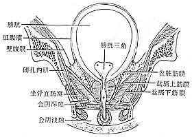 3、盆臟筋膜 包繞盆內臟器表面,是盆膈上筋膜向臟器的延續(xù)。在臟器周圍分別形成筋膜鞘、筋膜隔及韌帶等,具有支持和固定臟器的作用。如包繞前列腺形成前列腺鞘(囊),包繞直腸下血管及其周圍組織形成直腸側韌帶,以及參與固定子宮位置的子宮主韌帶和骶子宮韌帶等。韌帶內有通向臟器的血管、淋巴管和神經,有的還含少許平滑肌纖維。來自盆臟筋膜的腹膜會陰筋膜peritoneoperineal fascia,又稱Denonvillier筋膜,是一個呈冠狀位的結締組織隔,在男性稱直腸膀胱隔rectovesical septum,為盆臟筋膜延伸至直腸與膀胱、前列腺、精囊之間的部分。此隔上起直腸膀胱陷凹底的腹膜外面,向下經盆膈連于會陰中心腱,兩側附著于盆側壁。在女性稱直腸陰道隔rectovaginal septum,位于直腸與陰道之間。此外,盆臟筋膜還伸入陰道與膀胱、尿道之間,分別形成膀胱陰道隔及尿道陰道隔(圖4)。