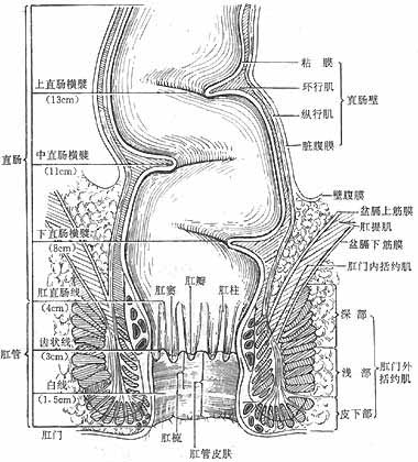 直腸兩側(cè)的上部為腹膜形成的直腸旁窩,兩側(cè)的下部(在腹膜以下)與盆叢,直腸上動(dòng)、靜脈的分(屬)支,直腸側(cè)韌帶及肛提肌等鄰貼。