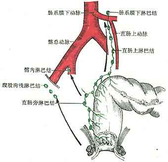 直腸的淋巴多伴隨相應(yīng)的血管回流,直腸上部的淋巴管沿直腸上血管引流,向上注入腸系膜下淋巴結(jié)。直腸下部的淋巴管向兩側(cè)沿直腸下血管注入髂內(nèi)淋巴結(jié);部分淋巴管向后注入骶淋巴結(jié);部分淋巴管穿肛提肌至坐骨直腸窩。直腸與肛管的淋巴管通過吻合支彼此相通,淋巴道轉(zhuǎn)移是直腸癌主要的擴(kuò)散途徑,手術(shù)要求徹底清除(圖3)。
