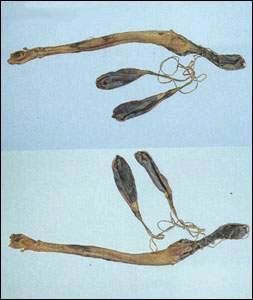 【生藥材鑒定】:海狗腎藥材來源不一,商品復(fù)雜,一般所用進口海狗腎(品種未定)為干燥的陰莖及睪丸。陰莖里長圓枚形,先端較細,長28~32厘米,干縮有不規(guī)則的縱海及凹槽,有一條縱向的筋。外表黃棕色或黃色,雜有褐色斑塊。后端有一長圓形、干癟的囊狀物,約4 x3厘米,或有黃褐色毛。睪丸二枚,扁長圓形,棕褐色,半透明,各有一條細長的輸精管與陰莖末端相連。輸精管黃色、半透明,通常纏繞在陰莖上。副睪皺縮,附在睪丸的一側(cè),乳黃色。以形粗長,質(zhì)油潤,半透明,無腥臭者為佳。 |